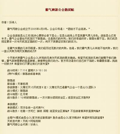 7月9日,《昆仑Online》官方网站惊现霸气网游公会对天机网游公会的邀战贴,尽显视死如归虽千万人吾往矣的决心。霸天网游公会将于7月11日(周六)19:00在【天尊密洞】和天机公会展开长达1小时的厮杀。PK分部落赛和个人PK两种模式,非常值得期待。届时,《昆仑Online》战地记者会全程跟踪采访这场盛况空前的部落PK。