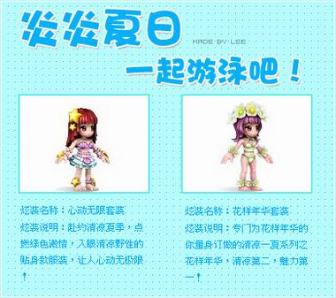 《QQ三国》MM泳装系列:对于可爱的“三国”MM来说,夏天不仅要穿的清凉,更要穿的时尚,那么小记为您首推第一款时下凉装“心动无限套装”,整个服饰由紫色贝壳所打造,还有金色的星星作为点缀,超短的白色迷你裙突显MM们曼妙身材,整个人看起来清新脱俗,让人心动。另一款“花样年华套装”属于性感类时装,也是泳装中的极品,在比基尼设计的基础上,搭配白色花瓣,走在“三国”的世界中,仿佛带来阵阵花的芬芳,让MM们香气逼人!