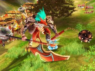 鳌是龙子之一,在外观上它是龙头龟背麒麟尾的合体鱼龙。作为《武林群侠传2》二转70级精英地图“未知村落”的区王,狂怒秘鳌还多了一副铠甲和左右手的不同兵器。它左手持流星锤,右手拿斧头枪,左右开弓起来的样子很是威猛。