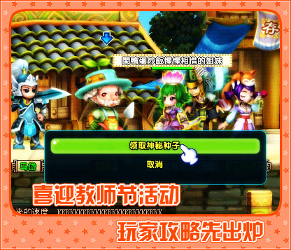 本次教师节期间,QQ三国重磅推出教师节活动,让您在节日中与师父联谊,感受浓浓的师徒情谊。只要在9月1日至9月20日之内,师徒组队找主城园丁Npc参与活动,就能领到神秘种子,然后就可以到苗圃中进行播种啦。苗圃都在各服的1线哦~因为教师节是世界性的节日,所以领取种子没有国家限制,在三个国家都能接到任务,这真是十分方便。