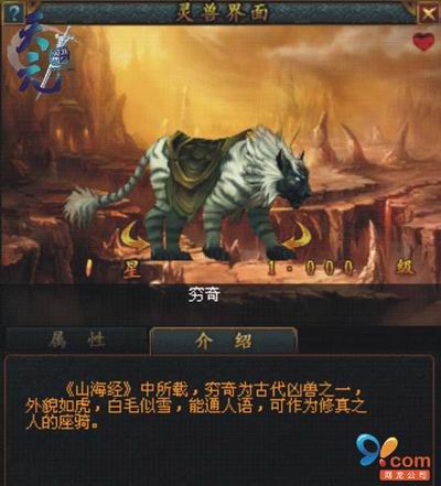 据《山海经?海内北经》中所载,穷奇是古代“四大凶兽”之一。其外貌像老虎,长有一双翅膀,能听懂人说话。在《天元》中赋予穷奇的同样还有力大无穷、雷厉风行、破坏力级强的形象特征。即为“凶兽”,可想而知穷奇必为攻宠,其身拥有的凶兽啸天技能可谓是穷奇的天赋之技,战斗之时仰天怒吼发出震耳欲聋之音,用以提升出征灵兽以及主人的战斗力,是玄幻世界中称霸一方不可多得的神奇守护神,不负第一凶兽的盛名。