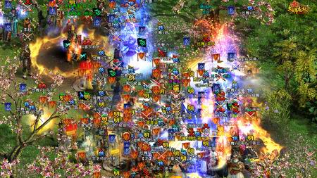 《大明龙权》每次测试,公会大战总是必不可少的一大亮点。此次封测自不例外,8月30日晚,一场惊心动魄的公会大战就在静湖桃林拉开序幕。十大公会分为红蓝两大阵营,漫山遍野的玩家阵容格外宏伟。正式开战后,电闪雷鸣、水淹火挡、风起土动,那天摇地动的惊天对战仿佛能撕裂整片桃林,跌宕起伏的战况更是扣人心弦。战事愈演愈烈,战场上甚至出现了传说中的瘟疫,平添精彩。而蓝方阵营通过改换频道实施的偷袭奇计更是神来之笔,让这场战斗凌驾于普通的PK,踏入策略性战术PK的新境界。此战精彩纷呈,盛况可谓空前。