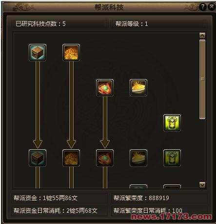 帮派科技是帮派系统中的另一大亮点,帮主可以借由消耗资金、繁荣度及帮派信物,学习帮派科技。帮派科技包含增加跑商配额、开设帮派商铺、领取俸禄额度、提升帮众经验等。那么如何才能积攒帮派资金与繁荣度呢?最简单的方法便是通过任务奖励。帮主发布帮派任务后,所有帮众都可以接取任务,身体力行地为自己的帮派做一份贡献!