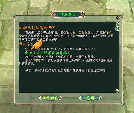 《仙魔OL》的新手引导做的还是很规矩的。上手任务很轻快,有自动寻路,同时报酬也不错,5级就能骑猪,算是很大方的游戏了。游戏每升一级会告诉你,你现在可以穿起什么装备、可以接什么任务、拥有了几点天赋、可以学什么技能,只要点画面右边的感叹号就全知道了。和许多国产游戏不同的是,《仙魔OL》是右键提交、攻击,右键才是动作键,左键只是选择键,这个在游戏开始时没做说明,希望今后可以在初入游戏时就有提示,毕竟一般人习惯都是从按左键开始的,呵呵。