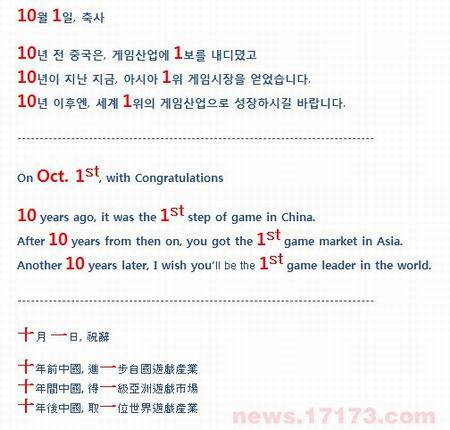 希望中国的游戏公司齐心协力,和韩国一同称霸亚洲网络游戏市场。祝贺中国建国60周年及中国游戏产业10周年。