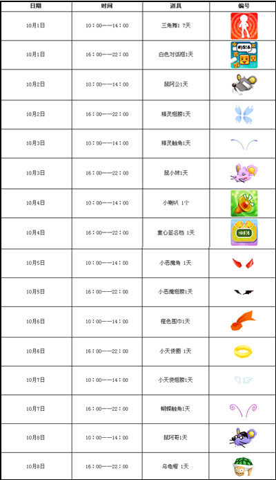三角舞1、白色对话框、鼠阿公、精灵翅膀、精灵触角、鼠小妹、小喇叭、童心签名档、小恶魔角、小恶魔翅膀、橙色围巾、小天使圈 、小天使翅膀、蝴蝶触角、鼠阿哥、乌龟帽。
