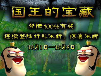 全区开启双倍经验爆卡TR甚至四倍,快速升级,大把赚钱的绝佳机会不容错过! 国王的宝藏登陆100%有奖