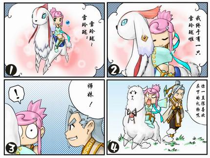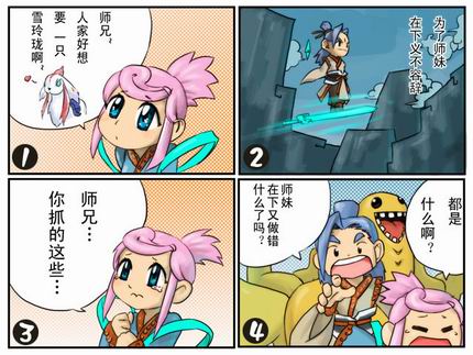 近日,网络流传一组极具人气的Q版四连张版画,是某位在《蜀山新传》游戏中的小小剑仙,为了追求一位甜美可爱的珠仙妹妹,在费劲九牛二虎之力后仍未抓到此妹妹向往已久的奇珍兽“雪玲珑”因而也就无法寻得佳人芳心,在追寻的过程中又受到了某阵营的日神残虐,估计在情场和战场的双重失利下,迸发出绚丽的创作灵感,以极度阿Q的精神在表达自我解嘲的洒脱的同时,也用猥亵的想象表达了对“残害”自己凶手的蔑视和嘲讽吧!不管怎么说,这份洒脱和豪迈、这种率真直接的表达,都从另一个方面体现了玩家真正可爱之处,就是蜀山人应该具有的洒脱和自由率真的个性,以及面临困难荣辱不惊、淡定从容的平常之心!