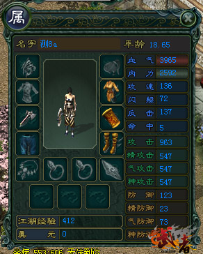 更新后的人物装备狂及属性栏,调整了右边栏的内容及颜色,攻击中增加了“精攻击、气攻击、神攻击”,防御中增加了“精防御、气防御、神防御”。多种攻击方式及防御方式的配合,体验新的武侠战斗。