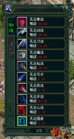 更新后的技能栏,更改了“武”的位置,移到了左边。修改了以往花哨的边框,整体的颜色,更加素雅,各种武学清晰可见。