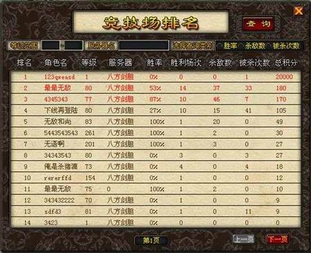玩家可以在NPC“3V3竞技嗜血战神”处查看排行榜,排行榜中能查询到所有玩家的战绩,包括胜率,竞技场积分,杀人数等数据。