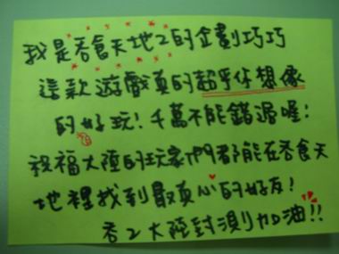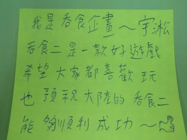 “要自己快乐,先让别人快乐”,说得多么有哲理啊。我们游戏运营,开发人员的快乐,当然更是建立在玩家们快乐的基础上的,《吞食2》就是这样一款能给您快乐的游戏。 这一定是出自一位MM之手,短短的一份祝福信也留下了自己可爱的特色,而且玩《吞食2》,最开心的恐怕就是开着鲁班盒聊天交朋友吧。 字并不是每个人都能写得一样好,但字后的拳拳真心,却是相同的。在当今这样一个电脑时代,我们多久才会用笔来写一次字;有了互联网、EMAIL,我们还会不会用笔写封信,亲自做张贺卡?中华网龙研发同仁的礼物,让运营组上下深为感动,我们相信,有着这样一群人在千里之外、海峡彼岸衷心地祝福我们,全力地支持我们,《吞食2》的封测将取得莫大的成功。