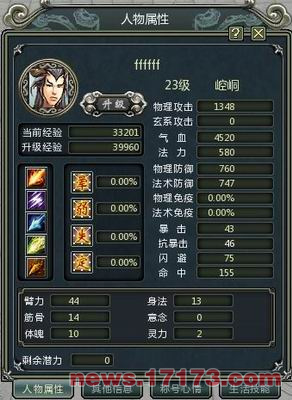 人物属性值包括主要属性:臂力,身法,筋骨,意念,体魄,灵力等,影响了人物的攻击力,防御力,血气,法力,命中率,暴击率,闪避率等,玩家可以根据自身职业特点选择加点,新手玩家还可以使用默认加点进行分配。