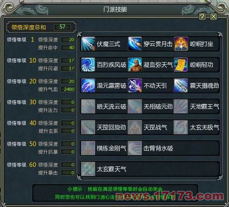 按V键可以打开门派技能,技能在人物达到相应领悟等级时自动学习,每10级可以领悟到新一层的技能。新领悟的技能等级均为1,需要去门派心法传授人处耗费一定金钱和经验来升级技能等级,提升领悟的深度。技能等级越高,升级所需要的金钱和经验也越多,在经验有限的情况下,是要用经验进行人物等级提升还是提升技能等级需要玩家根据自己的情况进行斟酌。