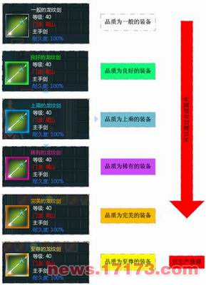 装备从品质上分为:一般的,良好的,上乘的,稀有的,完美的,至尊的6个品质。还有套装系统,穿齐几件或一套即可获得额外附加属性。装备主要通过打怪掉落,任务奖励,生活技能,幻兽兑换等方式获得。