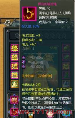 简评:官方将法宝系统做为此款游戏的一个特色来打造,从目前的情况来看,最吸引人的就是“装备提升功能”,用三件同样品质的装备可以提升成为一件高一个等级的装备,这对于刚上手玩家的黏着还是比较有力的。如果说法宝系统是此款游戏的一个主要的特色之一,那么肯定还有其他的一些功能或者玩法,由于当前玩的不深,这些都没有接触到,也给人一种期待!