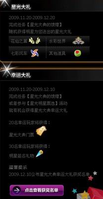 在游戏中还将有双重好礼送给你。2009年11月20日——12月20日,完成任务“星光大典的馈赠”就可随机获得明星为您送出的星光大礼。2009年11月20日——12月10日,完成任务“星光大典的馈赠”或者参与“星光明星票选”活动就有机会获得星光大典幸运大礼,各种游戏道具以及珍贵的星光大典门票、明星签名礼物都将免费送给你喔!