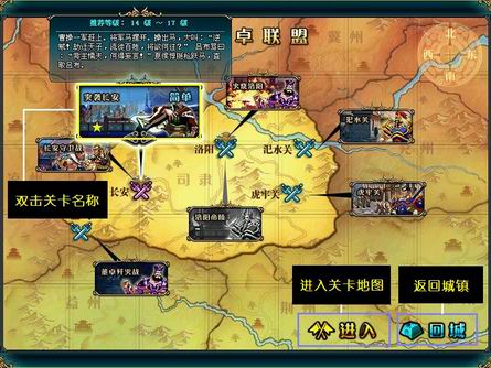 进入关卡后,请选择想要完成的关卡地图以及难度等级。双击一个关卡名称或者在选中关卡后点击“进入”按钮,就可以开始战斗啦!当然,如果您是误打误撞进了这里,或者想稍后再来,还可以选择“回城”来退出的哦。