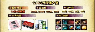 活动奖品:多份万元现金点卡,大量手机、ipod系列、MP3或游戏道具等大礼,100%获