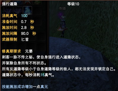 刺客职业的庇护系技能是其保护自身的“重要铠甲”,而“强行遁隐”技能就体现出了刺客技能的这一特点,用隐身的方式帮助玩家躲过敌人的眼球。正所谓“上有政策,下有对策”,隐身状态下的玩家,可以被反隐等级大于等于自己的怪或者玩家看到。碰到别人群攻的时候,隐身状态中的玩家也要“避嫌”,以免被他们打个“现形”,解除隐身状态!