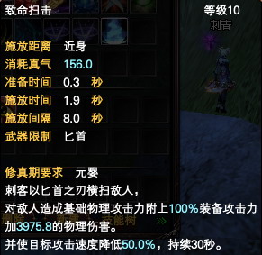 刺客不仅懂得闪躲,其强悍的攻击能力也是有目共睹的。刺客使用的技能中,“致命扫击”就是攻击敌人的重要招术。手持匕首的刺客运用这个技能,将对敌人造成基础物理攻击力附上60%装备攻击力,加1750.1的物理伤害,同时使对手的速度降低30%。刺客在与敌人交战,对其造成伤害的同时,还将削弱对手的速度,碰上刺客,那你今天真是“衰”啊!