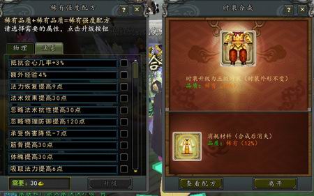 两件二级时装附魔属性越高对应合出的三级时装强力属性也就越高哦!二级附魔属性时装分为: 7%, 8% , 10%, 12%, 15% 对应鉴定等级分为: 普通,中级,高级,稀有,极品。如果您有两套15%二级附魔属性时装,那恭喜您,极品三级强力属性时装属于您啦!合成三级时装的时候配方属性任由自己选哦!加力量,法效,会心等等,这些极品属性都可以任由自己分配哦!升级费用根据时装属性的高低而收取,还有一点,三级时装升级是100%成功的哦!所以仙友们不必担心升级时装会像练法宝一样弄不好就炼化失败。