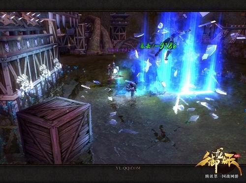 这一幅图则更加看重游戏的场景细节和技能光效,图中的敌人也是被玩家的攻击挑到了半空,不过这个技能比起上一幅图可是华丽了不少。幽蓝的光柱中悬浮着不少凌乱的冰块,一起组成了一个威力强大的结界,让身在此中的敌人无任何反击之力,只能乖乖束手就擒。再看地面上荡漾着一圈圈的水纹,原来战场是在一片浅浅的水域中,仔细看下面,还能看到人物的影子清晰的浮现在水面上,《御龙在天》的视觉效果不由让人小赞一番。