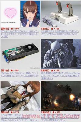 除统计各类新闻所占总数的比例之外,4gamer还把新闻按PV来进行排行,用★的多少表示PV的大小。因为2009年PV排行前十游戏PV值均比较高,因此用「★×000」的方式进行表示。