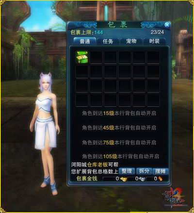 现在登录游戏,在等级到达15级、45级、75级、105级时,系统将自动为角色开启第5行、第6行、第7行以及第8行背包!