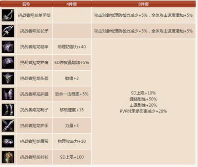 新奇迹世界赤色要塞系统因其刺激的打斗模式,丰厚的胜利奖励一直收到玩家们的亲籁,而来自赤色要塞的首套PVP装备-挑战者装备更是成为了众多爱好PVP玩家们的追捧目标,在2010新春版中,大家期待的挑战者套装属性将正式更新,与同样在新春版中更新的护盾(SD)系统相结合,将会使您的PK更有乐趣。挑战者套装的属性究竟有多强大?每个职业的挑战者套装又有什么不同?接下来就为大家一一揭晓。