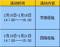 2010年2月15日至2月21日,全服将开启多倍经验活动,在线玩家均可享受打怪经验奖励加成。这对于广大新老玩家来说,都是一个快速升级的绝佳途径。和过去同样的付出,却能拥有双倍的回报,让你在新年中的快乐也跟着翻翻,何乐而不为?