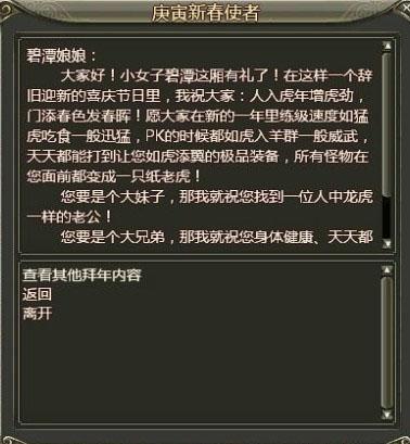 在庚寅新春使者处,BOSS们都将自己的心情感悟交给了他哦!其实BOSS们也想过个好年,因此为玩家们带来新春祝福,希望各位在新的一年中能够手下留情……