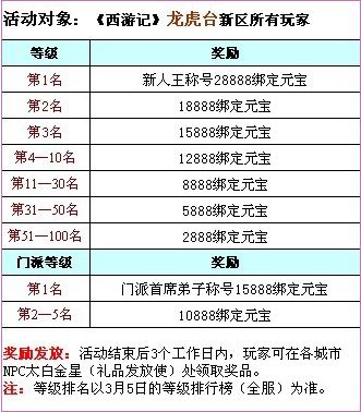 2月26日18点-3月7日24点,《西游记》新人王争霸赛在新区“五指山”火热上演。活动结束后,位列世界排行榜第一名的新人王玩家,将得到《西游记》运营团队28888元宝奖励。对于在活动中脱颖而出的其他精英玩家,同样可获得金额不等的元宝奖励。