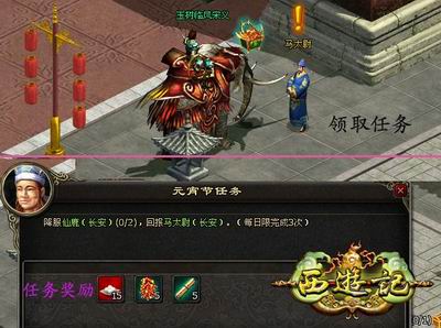 2月25日-3月1日,玩家每天可到长安城NPC马太尉处领取元宵节任务。玩家完成NPC的任何一个愿望,就可获得礼花、灯谜、小元宵等丰厚奖励。