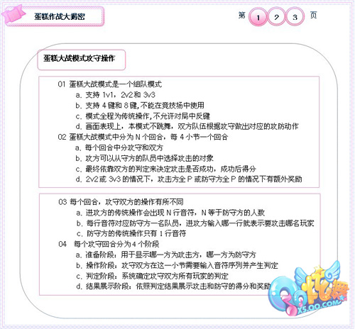 蛋糕大战模式是一个组队模式,适合单人组队、双人组队以及三人组队。模式全程为传统操作,不允许对局中出现反键!这场战争中,将改变一成不变的舞蹈模式。双方队伍根据攻守做出对应的攻防动作!每4小节为一个回合,每个回合中分出攻守双方,攻方可以从守方的队员中选择攻击的对象,最后将根据双方的判定来决定攻击或防守是否成功!成功后,即可获取得分!每个回合,攻守双方的操作有所不同,进攻方的传统操作会出现与对方人数相同的行数音符,玩家通过按键自由选择要攻击的对象。防守方则只有一行音符!
