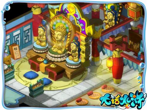 蓬莱是渤海里仙人居住的三座神山之一,大家要变成星将,就要来这里找女娲娘娘。这个呢,是蓬莱仙岛上的弥陀寺。