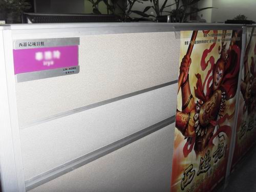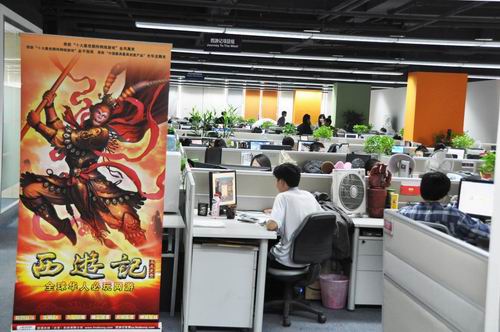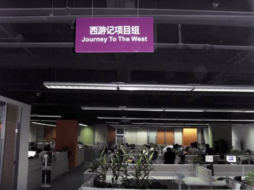 蓝港在线写字楼的第上层一进门就是《西游记》项目组了,门口立着的《西游记》宣传易拉宝和头顶的部门牌充分说明了这一点。