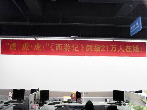 我还看到在《西游记》项目组后面的墙壁上,挂着“虎!虎!虎!《西游记》剑指21万人在线”的宣传标语。这是这款游戏内测时候定下的目标。ZG说,我们现在游戏已经在周一突破了22万人在线,达到了这一目标。而本周游戏还会开5组新服,迎接更多玩家的到来。