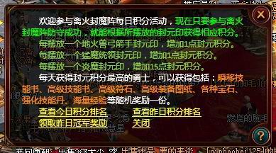一旦玩家成功防守了离火封魔阵,还将根据玩家的表现获得封元积分,参与每日离火封魔阵的冠军争夺,有机会获得各种高级奖励。另外每日达到20点封元积分,就能开始赏金密令的任务了。