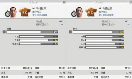 在足球游戏世界中,数值真实能体现球员能力的足球网游《FIFA online 2》中,马特拉济虽然年龄不小,但是数值还比较客观,身体力量84不亚于年轻人,防守功力混迹足坛多年他早已经验十足,95的侵略性则是马特拉济张扬的足球风格的诠释,在这场欧冠赛事中,马特拉济在数次拼抢中也完成了铁卫应尽的职责,没有给对手任何的机会。