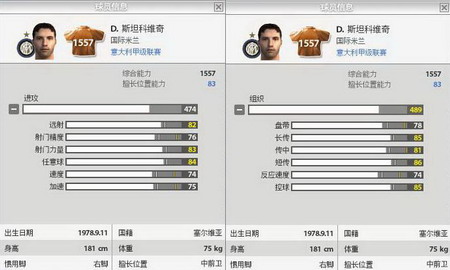 中场组织方面斯坦科维奇是朴实无华行,数值整体都保持在85左右,没有亮点,但是勤恳的完成教练布置的场上人物,这样的球员是目前比较浮华的国米所欠缺的。