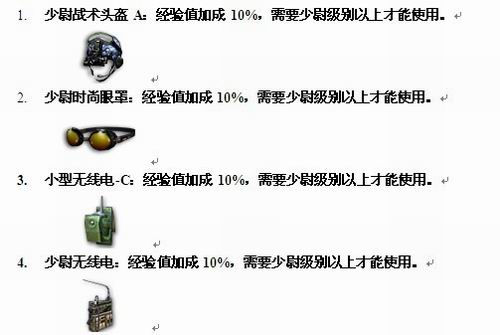 一直苦于没有新道具搭配的玩家这次一定觉得幸福了,全新少尉道具的种类包括了,帽子,眼镜、面具、携带物品多个种类,不仅仅弥补了所有爱美玩家的装扮心里,更是丰富了游戏的道具种类。少尉战术头盔,少尉战术眼镜搭配在一起,不仅仅有20%的经验加成,更是让一个闪亮的角色新形象出现在大家眼前,谁说只有少校可以有特殊,少尉一样最闪亮。10%经验加成的小型无线电,更是装配起来帅气无比。