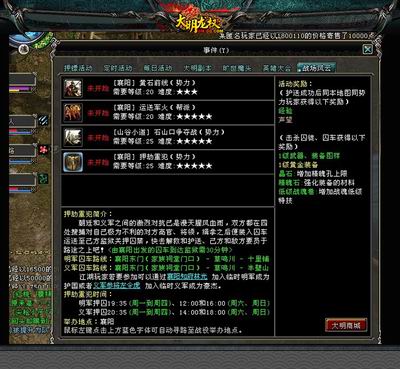 **(明军)和豪杰(义军)之间的激烈对抗已是腥风血雨,双方都在四处搜捕对己方阵营极为不利的对方高官、将领,缉拿后便将其关入囚车在每天的指定时间运送到己方监狱关押囚禁。护送成功的势力人员将会得到海量经验以及声望,而击杀敌对阵营囚车以及囚徒更有可能掉落极其珍贵的低等级黄金装备,以及其他众多商城道具。在这三十分钟的漫漫囚车前进途中,守卫方小心翼翼,抢夺方蠢蠢欲动,两阵营的玩家协同高AI的NPC强势PK,究竟鹿死谁手,要试过才知道。