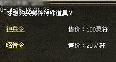 4、 “神兵令”有120秒冷却时间的限制。为消耗物品,耐久10/10,每成功使用一次扣除一点耐久。该物品购买后为绑定,不可交易,不可丢弃,不能爆出。