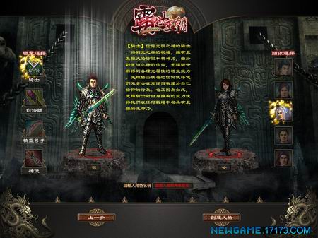 玩家输入帐号登入后,随即就要先创建人物,先选个联盟,再依照光芒或战神联盟选择职业,光芒联盟有骑士、白法师、精灵弓手、神使。