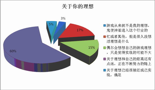 小结:通过对业界各职业的生存分析调查,90%以上的游戏人表示对收入还不够满意。尽管如此,超过80%的游戏人依然热爱着游戏,对行业保持着兴趣,“痛并快乐着”恰如其分的说明了业界劳民的生存普遍状况。
