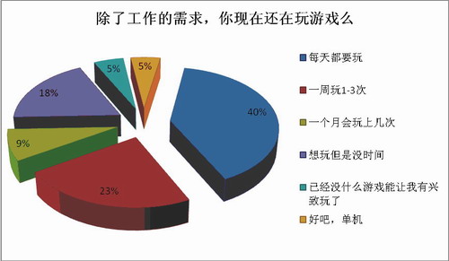 —— 每日必玩的游戏人高达40%,而一周玩1-3次的游戏人已有23%,再次证明了游戏人对游戏的热爱。好吧,游戏不仅能缓解疲劳,释放压力,甚至还能从中发现对工作有益的东西,实为游戏人必备良药~
