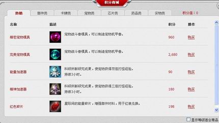 积分可以在商城中兑换各种礼品,部件、卡牌、宠物、芯片、药剂等应有尽有,选择多多,乐趣多多!