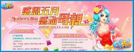 5月9日是母亲节,毫无疑问,只有康乃馨能传达这感恩的情绪,而《QQ炫舞》,将用一个多星期的时间去感恩。先完成任务“送上给妈妈的礼物”;再“真情许愿,让爱尽情涌动”,然后培育鲜花,在盛开的时刻,为母亲留下最美的瞬间;双倍的真情有双倍的经验、G币和舞团资源,这是炫舞对孝顺的你的嘉奖;最后,把想说的说出来吧,不要在记忆中留下遗憾,请在论坛留下回忆。