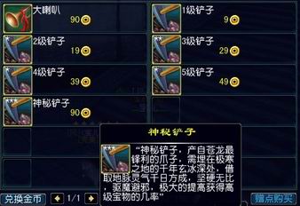 当你得到梦寐以求的“藏宝图”后,再带上挖宝的必备之物品——铲子,开启你的摸金寻宝之旅吧。别说你不知道铲子哪里来,活动奖励,商品道具,5个类别的铲子随你选。据说等级越好的铲子挖宝出高级物品的概率越高哦。